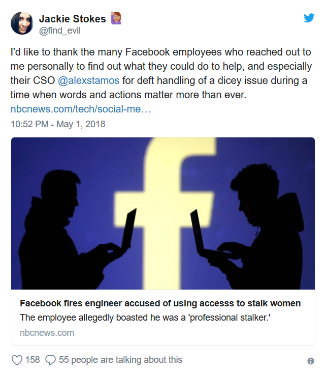 Facebook then reached out to Stokes for more information. Alex Stamos, Facebook’s chief security officer, gave the following statement: