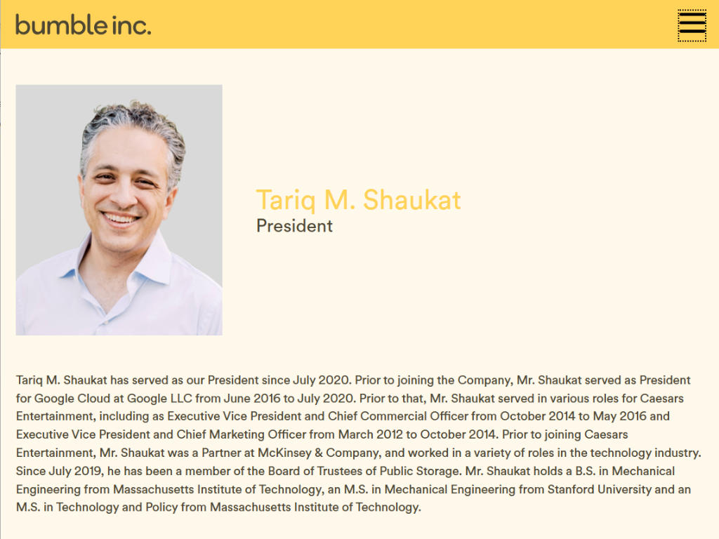 After three years heading up Bumble, Inc., President Tariq Shaukat has announced he will be stepping down from his role effective September 1, 2023. He will be moving to an advisory role during the transition period, according to the company.