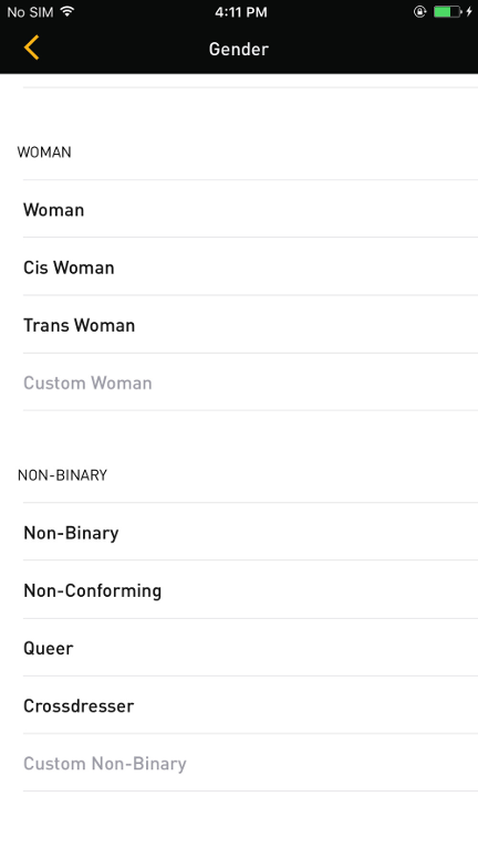 Following similar moves by OkCupid and Tinder, Grindr has unveiled new options for users who identify as transgender and gender non-conforming. Options for gender now include "cis man," "trans man," "non-binary," "non-conforming," "queer," and "crossdresser." Users can also specify a custom identity if theirs doesn’t appear on the list.
