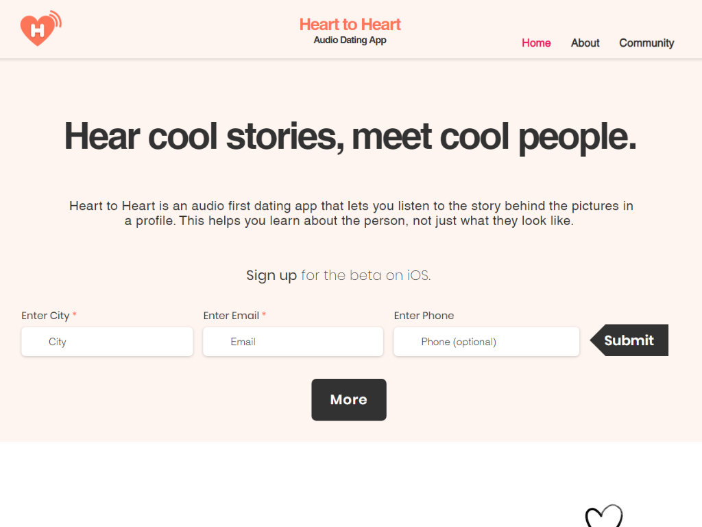 Similar to other dating apps, a Heart to Heart user creates a profile and uploads photos, but then they are also prompted to record audio to accompany the photos and explain where they were, what they were doing, or anything else interesting about the photo and why they wanted to include it.