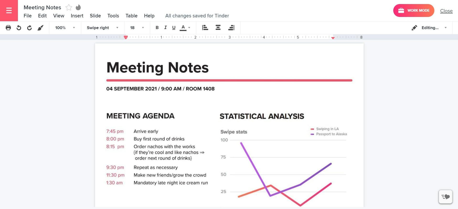 Work Mode looks like a Google doc page with a menu at the top. The left side of the page contains a header that says: “Meeting Agenda” with some dating tips disguised as bullet points, with advice like “arrive early” and “buy first round of drinks.” On the left side of the page, there’s a chart with the headline “statistical analysis” with a generic line graph.