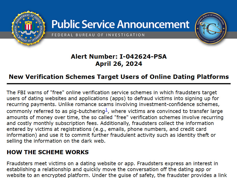The FBI has issued a new warning for dating app users about a scam that involves “verification,” which raises more problems for the platforms as they roll out new safety features.